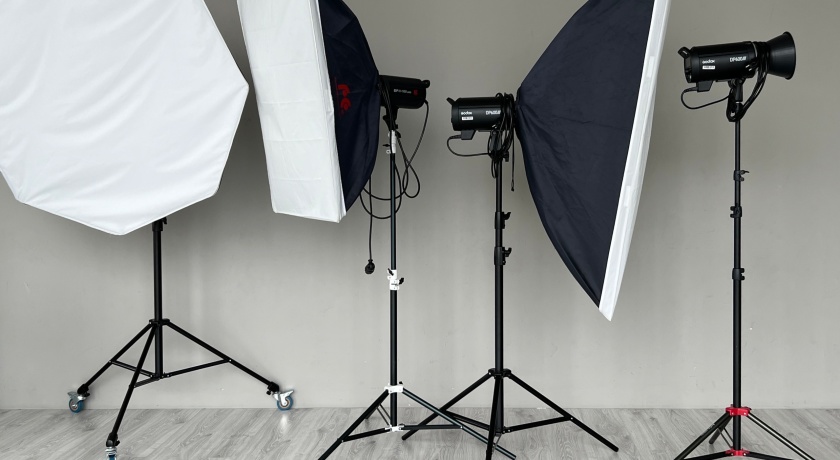 + насадки: софтбокс, стрипбокс, октобокс, зонт 165см диаметром, тарелка, рефлекторы.