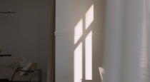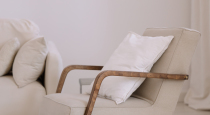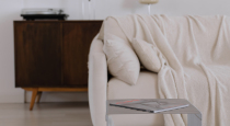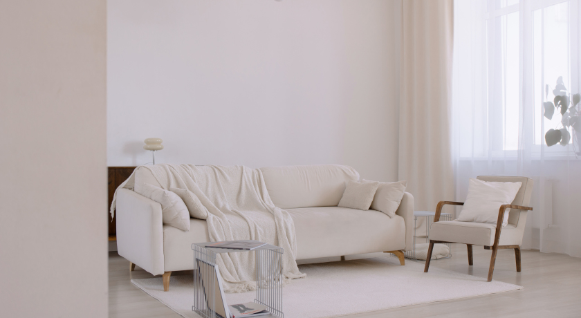 — Диван в светлых бежевых оттенках на фоне белой стены с коричневой тумбой