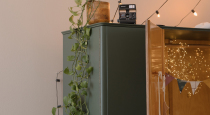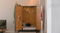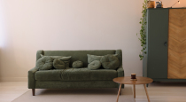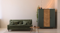 — Светло бежевая стена со шкафом, зеленым диваном и детской зоной