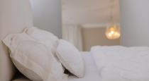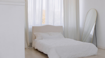 — Кровать на фоне окна светлых оттенков с зеркалом