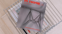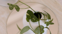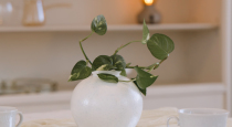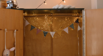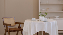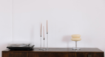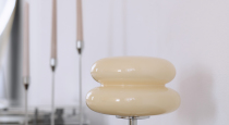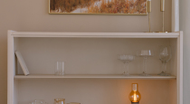 — Стена со столом с композициями на фоне тумбы с люстрой