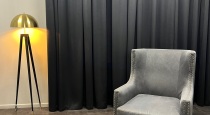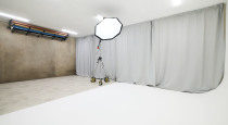 Вдоль всей стены с окнами висят блэкаут шторы, которыми можно не только управлять светом, но и использовать как нейтральный тканевый фон.