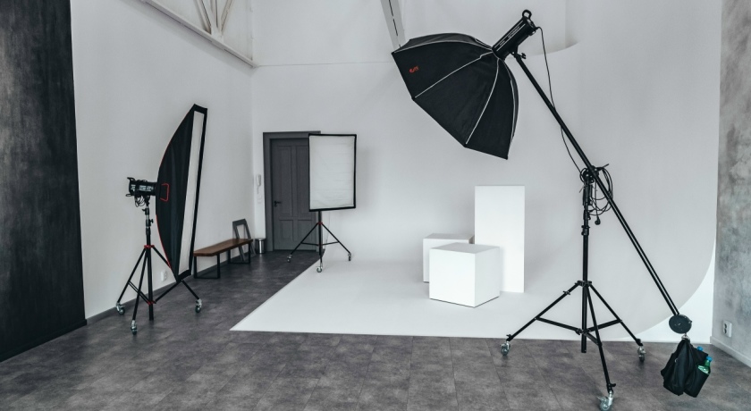 В аренду зала входит съемочное пространство, три импульсных моноблока, софт боксы и окто боксы, а также реквизит находящийся в зале.
