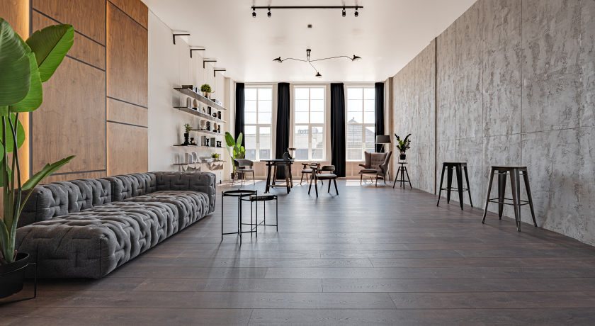 Фактурная бетонная опалубка ручной работы, дизайнерские стеллажи из металла, легендарное кресло Eames Lounge Chair (дизайнеры Charles and Ray Eames, США), большой дизайнерский диван в стеганой обивке, письменный стол и роскошное кресло руководителя, кожаные стулья для интервью, геометрическая стена из 25 шпонированных под орех панелей с подсветкой, реечная стена с внутренней геометрической подсветкой, лофт стена - монолитный бетон, лофт торшер. Пол в декоре под натуральную дубовую доску со специальным ультраматовым покрытием.