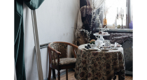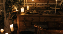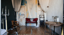Есть также зона кабинета, с антикварным рабочим столом и антикварным диваном.