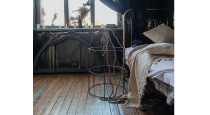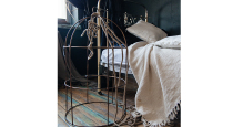 В углу зона с кроватью и прозрачным балдахином, на фоне зеркал.