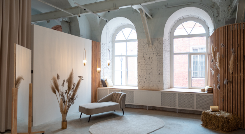 В зале Albus 32 м2, высота потолков 5 м, солнечно в первой половине дня с 10.00 до 14.00.