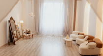 Большой и светлый зал с угловой циклорамой, две интерьерные зоны с мебелью в стиле эстетики Pinterest. Солнечная сторона и много естественного света в течении всего дня. Набор профессионального светового оборудования.