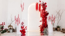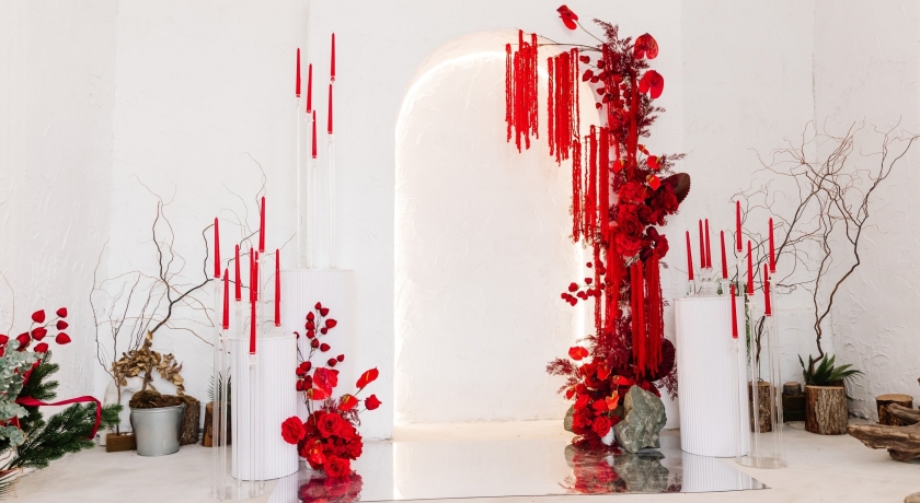 - Романтичная зона с красным бархатом, драпировками и сердцем;