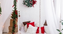 - Уютная, с зеленым бархатом, елкой и подарками, идеально подойдет для семейных съемок;