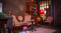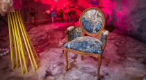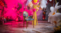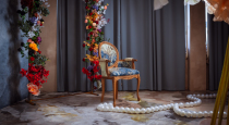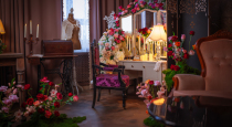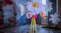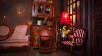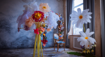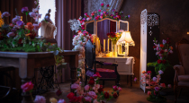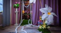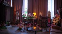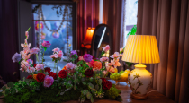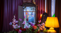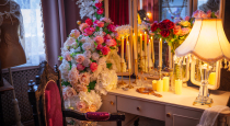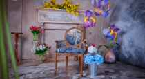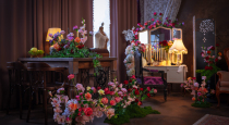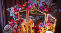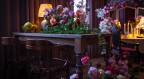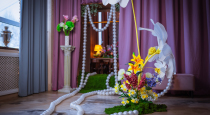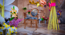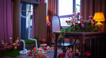 Единый зал с несколькими художественными локациями с винтажной мебелью и цветочным декором.