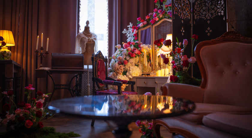Единый зал с несколькими художественными локациями с винтажной мебелью и цветочным декором.
