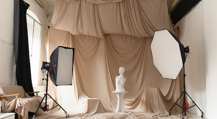 В стоимость входит: до 2-х источников импульсного света, а также 1 источник постоянного. В зале есть кубы, флаги и журавль. По запросу, мы подготовим любой фон из нашей коллекции.