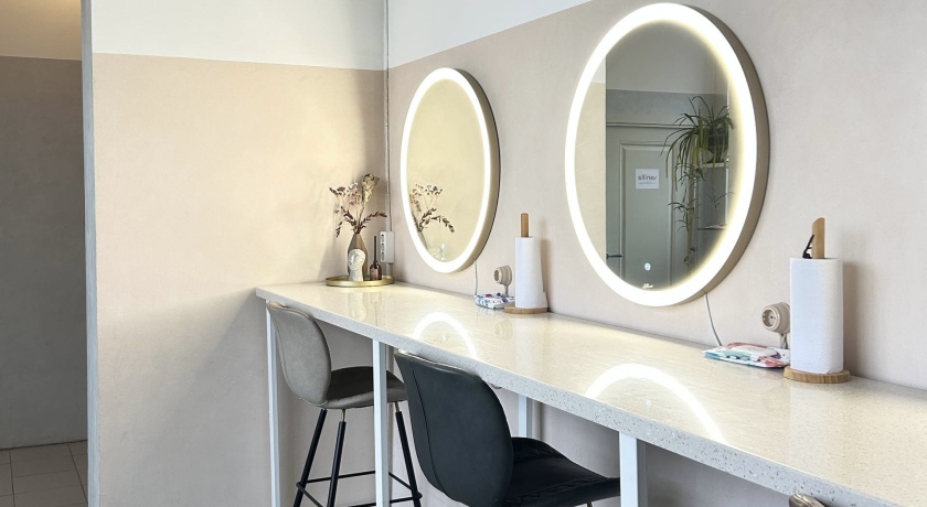 2.5. В зоне ресепшн есть 3 гримерных места, доступные к заказу отдельно от залов. Гримерное место представляет собой место за общей столешницей, пожалуйста, учитывайте это при бронировании. . Каждое место оснащено зеркалом с ярким естественным светом и розеткой для подключения плойки/фена, и достаточно для размещения всех необходимых аксессуаров для мейка и укладки. Стоимость часа аренды гримерки в зоне ресепшн с 9.00 до 21.00 – 300 руб.