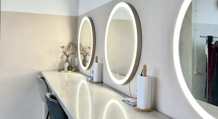 2.5. В зоне ресепшн есть 3 гримерных места, доступные к заказу отдельно от залов. Гримерное место представляет собой место за общей столешницей, пожалуйста, учитывайте это при бронировании. . Каждое место оснащено зеркалом с ярким естественным светом и розеткой для подключения плойки/фена, и достаточно для размещения всех необходимых аксессуаров для мейка и укладки. Стоимость часа аренды гримерки в зоне ресепшн с 9.00 до 21.00 – 300 руб.