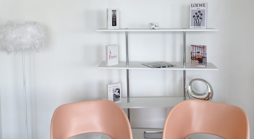 два стильных кресла для съемки интервью и подкастов и штора в цвет для созданий монохромной локации;