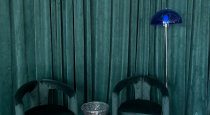 два стильных кресла для съемки интервью и подкастов и штора в цвет для созданий монохромной локации;