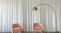 металлическая стена, оранжевые шторы;