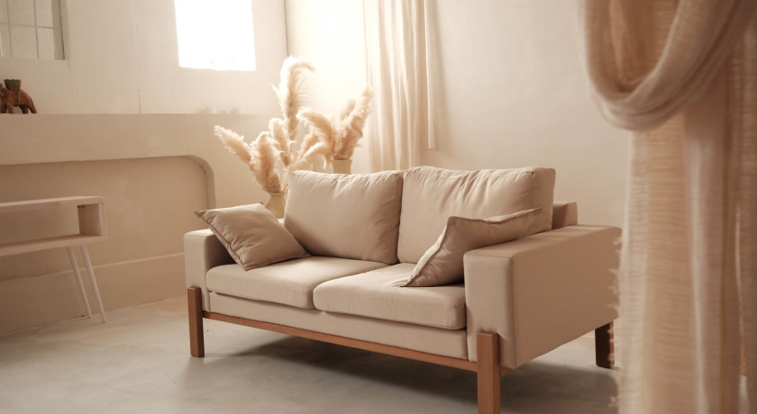 Зал про чистую эстетику и воздух: нейтральные стены, мягкий диван, японская кровать, лёгкий текстиль, аккуратный декор — универсально для портрета, индивидуальной съемки, свадеб, love story, семейных историй, будуара, ню, контента и видео.