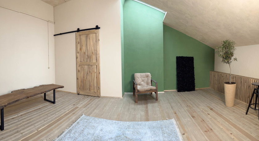 Деревянный паркет, скамья слэб из карагача с фактурным краем, текстурная каменная стена, а также натуральное дерево оливки и дополнение в виде мебели и другого инвентаря, которые помогут в создании "тех самых" кадров!