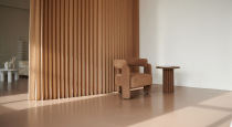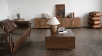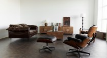 Зал с винтажным паркетом, деревянной стеной и дизайнерской мебелью.