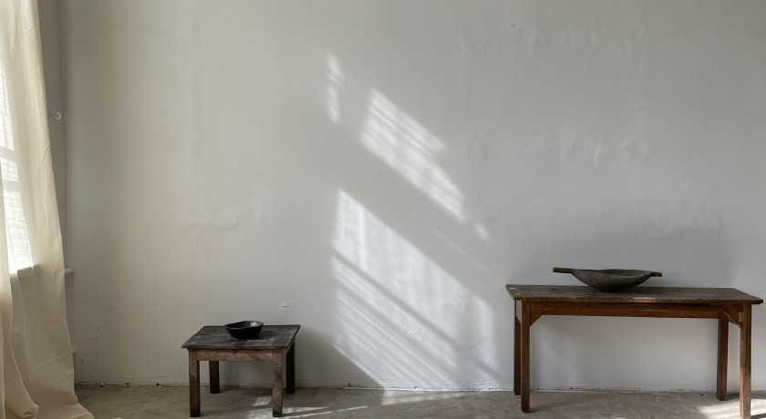 Зал мастерская: белые стены, большое окно, паркет, деревянная мебель, керамика. В мастерской есть раковина с холодной водой. Окна выходят на Юго-Восток.