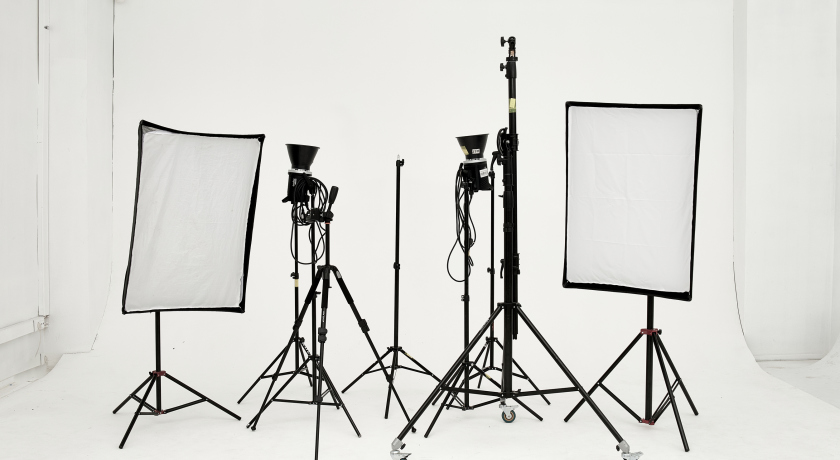 Просторный светлый зал с циклорамой размером 5х5 метра и общей площадью 50 кв.м оборудован светом на пантографах или стойках, а также имеет потолки высотой 4,4 м. В зале предусмотрены удобная кабинка для переодевания, три белых куба разного размера, флаги, стационарные и передвижные рейлы.