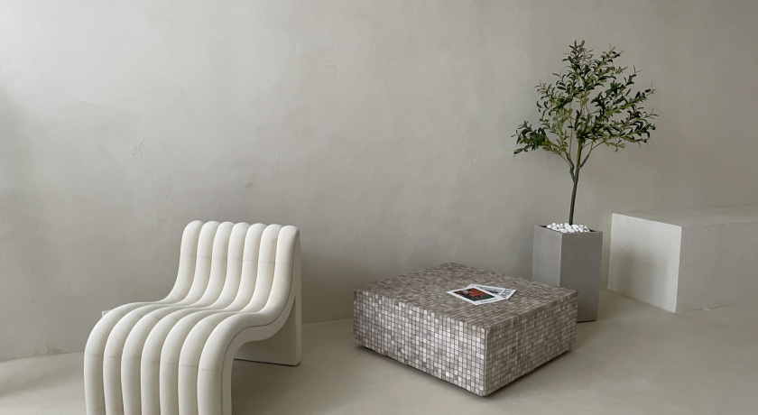 Серый столик из мелкой плитки, мягкий серый пуф;