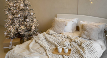 Интерьерная локация с имитацией спальни - кровать с белоснежным постельным бельем, белый журнальный столик и телефон, кресло-барашек;