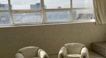Стены и полы в зале выполнены из одного материала холодного светло-бежевого цвета. Окно размером 5,6×2,8 м хорошо освещает зал. На случай солнечной погоды в зале есть плотные шторы. При необходимости, они избавят от прямого солнца, но полного блэкаута не дадут.
