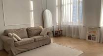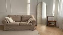 В нем находятся: Светлый диван, дизайнерское кресло, стильное настенное панно и множество интересных деталей!