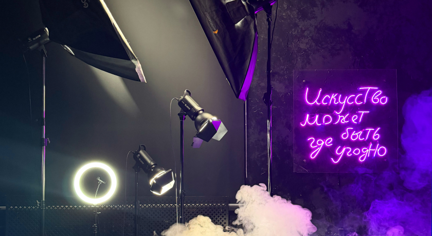4 постоянных источника света Godox (софтбокс, стрипбокс, шторки, шторки), цветные фильтры, кольцевая лампа, вентилятор и главное – дым-машина!