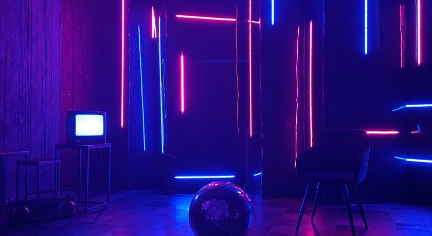 Зал визуально разделён на две части – тёмную с неоновой стеной и светлую с растениями. Весь декор, представленный на этой карточке, входит в базовую аренду!