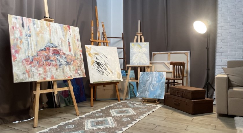 - Локация с мольбертами и холстами.