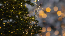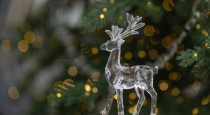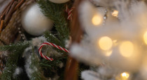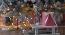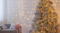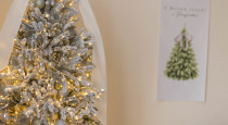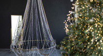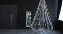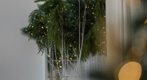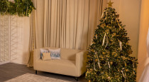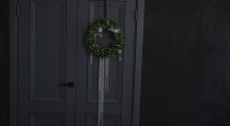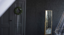 В темной части люстра, как вы и просили, без изменений. На двери новогодний венок, но его можно легко снять. На границе темной и светлой части расположились две ёлочки. Одна с бантиками и чёрно-золотыми украшениями, а вторая минималистичная в хрустале и огоньках.