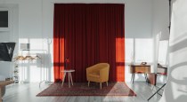 — акцентная зона с красными шторами, жёлтым креслом и винтажными деталями;