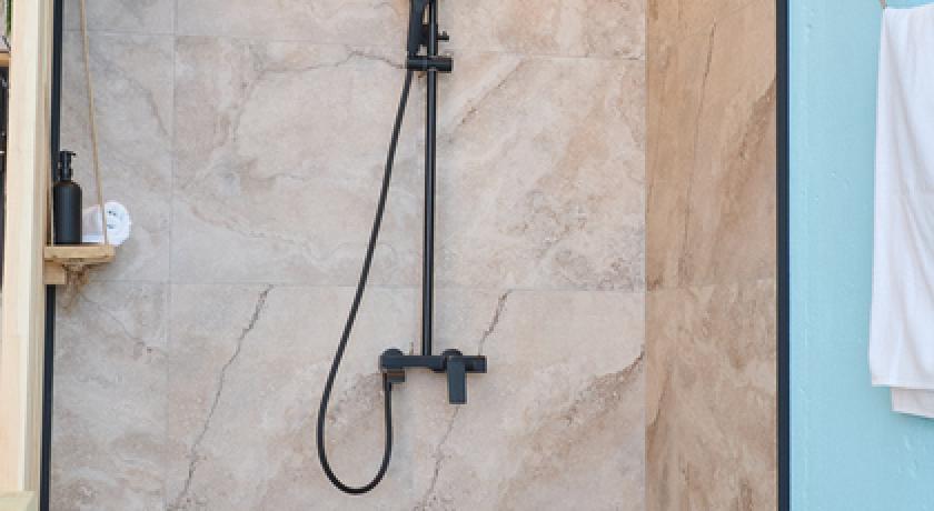 Ванная открытого исполнения, выполнена в стиле SPA, открытая душевая с элементами, имитирующими морские пейзажи;