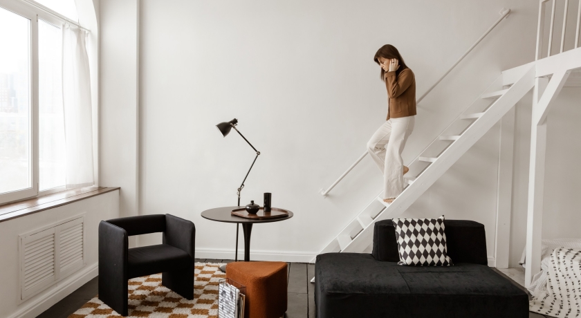 Зал Гарден известен своим уютом и белой лестницей. Здесь матовый черный пол в обрамлении светлых стен, арочные окна, хороший естественный свет. Зал подойдет для семейных съемок, съемок брендов, деловых и индивидуальных портретов. Также в зале есть сочная сливовая стена и нежно-розовый комод - разбавили монохром красками.