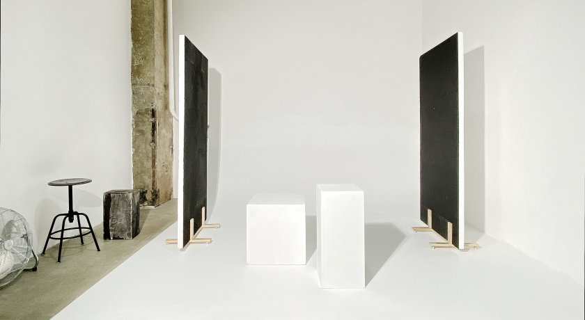 В зале ест гримерный стол, 2 стандартных черно-белых флага, а также большая передвижная стена 2.5х2 метра темно-серая / светло-серая.
