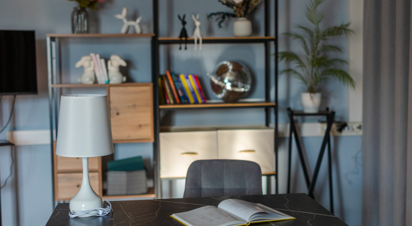- офисная зона со стеллажом, которую можно дополнить стулом со столом или парой кресел для съёмки интервью