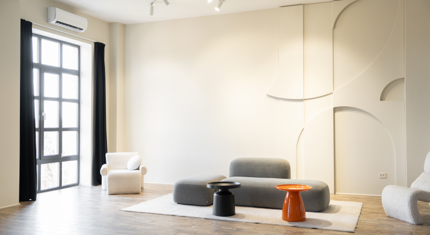 Светлый и воздушный зал, где каждая деталь создана для вашего комфорта. Панорамные окна от пола до потолка наполняют пространство мягким естественным светом, создавая идеальные условия для съемки.