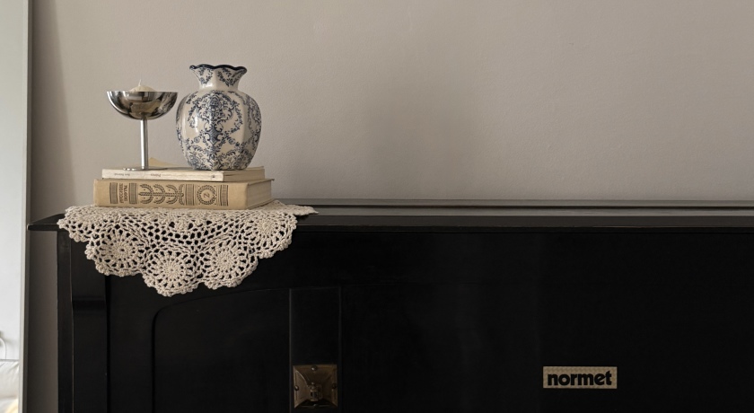 В зал ведут белые распашные двери, сквозь которые можно поймать интересные ракурсы. Просторная зона в виде большого светлого дивана с контрастным кантом с одной стороны и многообразие локаций для фото - с другой: винтажное пианино, буфет с разнообразной посудой, круглый стол с минималистичной, но акцентной сервировкой и большое напольное зеркало.