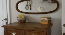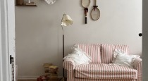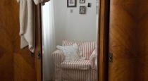 Триптих из дивана, кресла и пуфа в полоску, винтажный комод, советский платяной шкаф, двухметровое зеркало и книжный стеллаж.