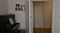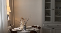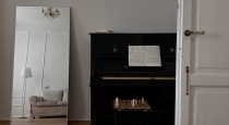 В зал ведут белые распашные двери, сквозь которые можно поймать интересные ракурсы. Просторная зона в виде большого светлого дивана с контрастным кантом с одной стороны и многообразие локаций для фото - с другой: винтажное пианино, буфет с разнообразной посудой, круглый стол и большое напольное зеркало.