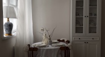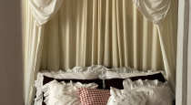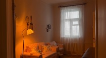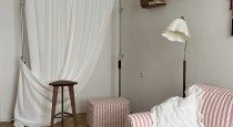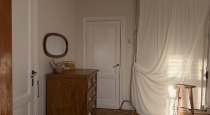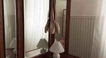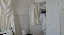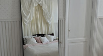 В центре комнаты — кровать с балдахином, рядом с которой расположены прикроватная тумба, встроенный шкаф с летящими платьями, напольное зеркало в деревянной раме — всё, что нужно для создания женственных и романтичных кадров. По разные стороны от балкона расположены ширма для переодевания и винтажное трюмо с реквизитом для предметных снимков.
