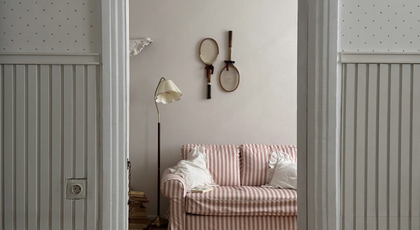 Триптих из дивана, кресла и пуфа в полоску, винтажный комод, советский платяной шкаф, двухметровое зеркало и книжный стеллаж.