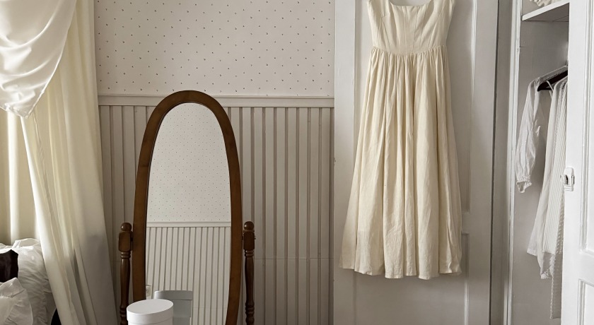 В центре комнаты — кровать с балдахином, рядом с которой расположены прикроватная тумба, встроенный шкаф с летящими платьями, напольное зеркало в деревянной раме — всё, что нужно для создания женственных и романтичных кадров. По разные стороны от балкона расположены ширма для переодевания и винтажное трюмо с реквизитом для предметных снимков.