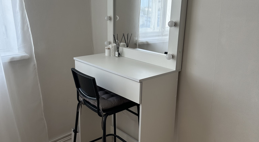 В центре комнаты — большая кровать, рядом с которой расположены прикроватная тумба, встроенный шкаф с летящими платьями, напольное зеркало в деревянной раме — всё, что нужно для создания женственных и романтичных кадров. По разные стороны от балкона расположены ширма для переодевания и винтажное трюмо с реквизитом для предметных снимков.