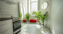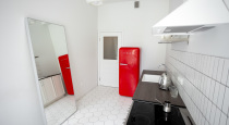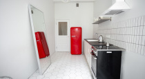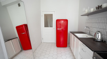 1)Зал Кухня - минималистичный интерьер с акцентами ретро: кухня в стиле «парижская квартира», красный холодильник SMEG, плитка «кабанчик», дневной свет и мягкие тени. Идеально для beauty, рекламы, контента и уютного lifestyle.