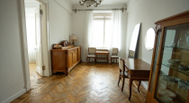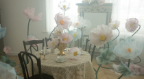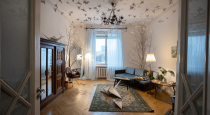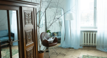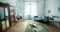 Пространство из двух соединённых комнат — больше, чем просто интерьер. Это возможность создать разнообразные кадры без смены локаций. Зал оформлен в духе светлой европейской квартиры начала XX века: антикварная мебель, лепнина на потолках, высокие окна с лёгкими шторами и тёплый паркет «ёлочкой».